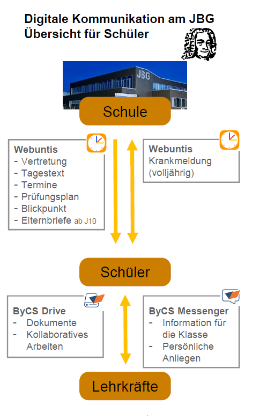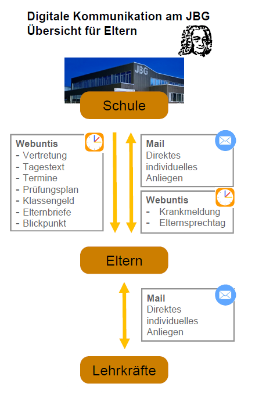 Die folgende Übersicht erläutert, wie die digitale Kommunikation zwischen Schülerinnen und Schülern, Eltern sowie Lehrkräften am JBG abläuft.